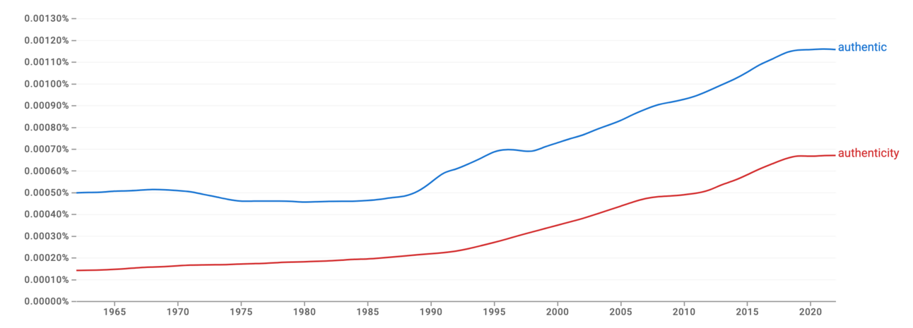 Over the past 60 years, the concepts of "authentic" and "authenticity" have seen a marked rise in public discourse, as indicated by Google’s Ngram Viewer, which analyzes the frequency of words in a vast number of books. The data shows that, until around 1989, both terms had relatively low usage. However, starting in 1989, both terms began to gain prominence, more than doubling by 2021. This pattern suggests a significant cultural shift towards valuing authenticity, particularly over the last few decades.