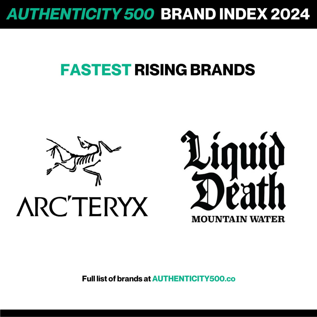 Arc'teryx and Liquid Death both hold the title of fastest-rising brands on this year's Index, having jumped five spots in the rankings.